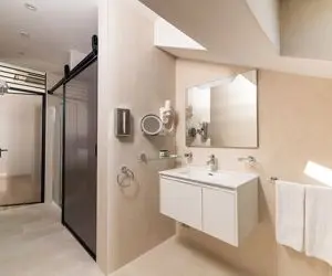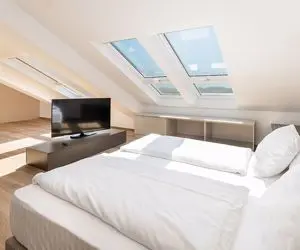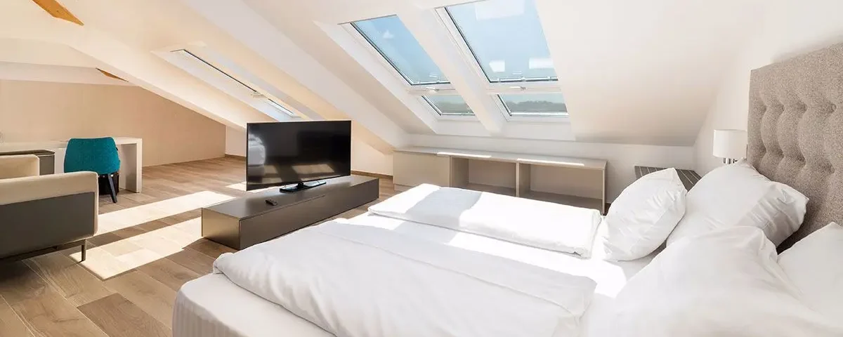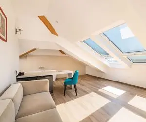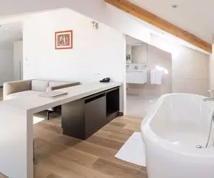 Der Junior Suite Loft befindet sich in der obersten Etage des Dachbodens und bietet eine wunderschöne Aussicht. Es hat eine Fläche von 20 bis 26 m2 und ein Super King (200 × 200 cm) Doppelbett. Möglichkeit eines Zustellbettes für Kinder bis 10 Jahre auf Anfrage. Die Wohnung ist mit einem Smart-TV, einem Schreibtisch und einem Sitzbereich ausgestattet. Das Badezimmer verfügt über eine Dusche und einen Haartrockner. Die einzigartige Tatsache dieser Wohnung ist, dass sie sich im Wohnzimmer befindet, was sie noch spezieller macht. Telefon, WLAN, Safe und Klimaanlage mit Heiz- und Kühlfunktionen sind Standardvorteile sowie die Nutzung einer Minibar gegen Aufpreis.